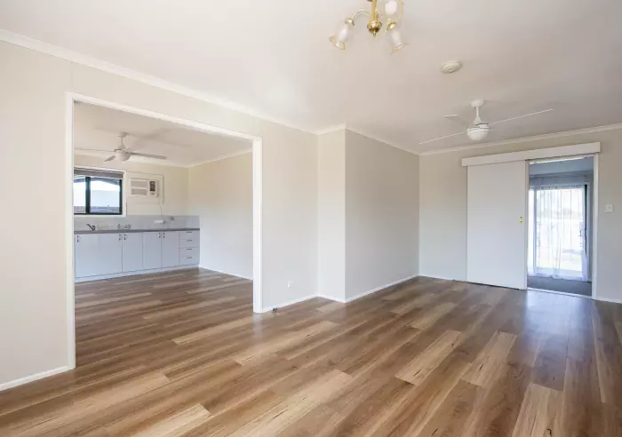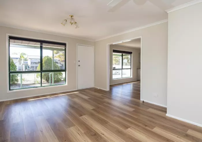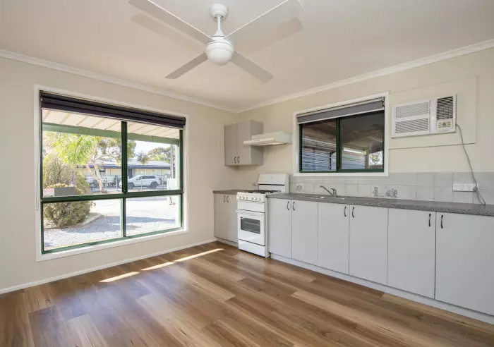 Comfort is front of mind, with floating floorboards in the kitchen and living areas, and carpeted bedrooms for added warmth. Climate control is well-covered with ceiling fans in Bedroom 1, the kitchen, and the living room, plus RAC air-conditioners in both the kitchen/living area and Bedroom 3.