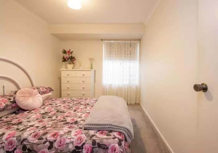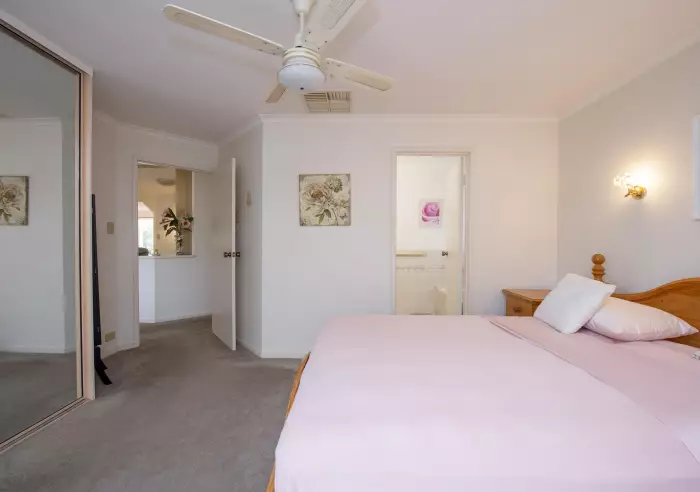 The master suite boasts a built-in wardrobe and enjoys the convenience of a shared 2-way bathroom, complete with a bath, shower, and vanity. The two additional bedrooms are generously sized and carpeted for added comfort.
