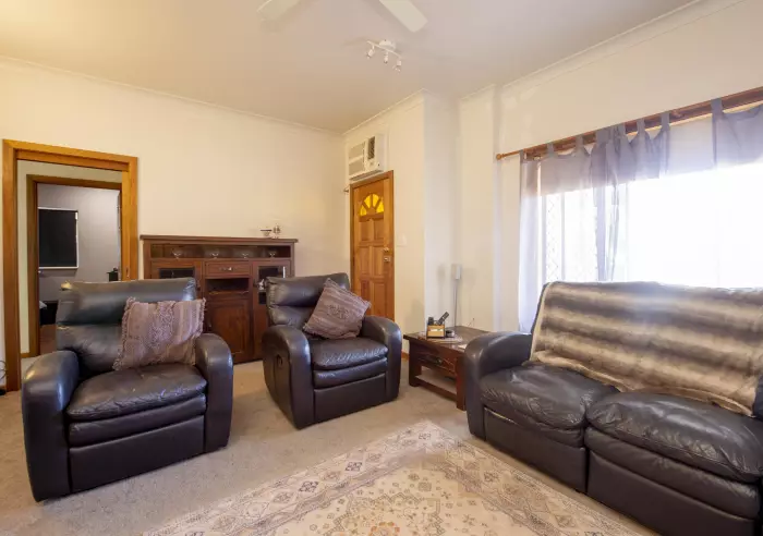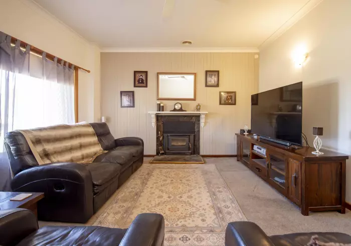 Step inside to a welcoming carpeted lounge room with a cosy wood fire, a ceiling fan complete with a reverse cycle A/C — perfect for year-round comfort.